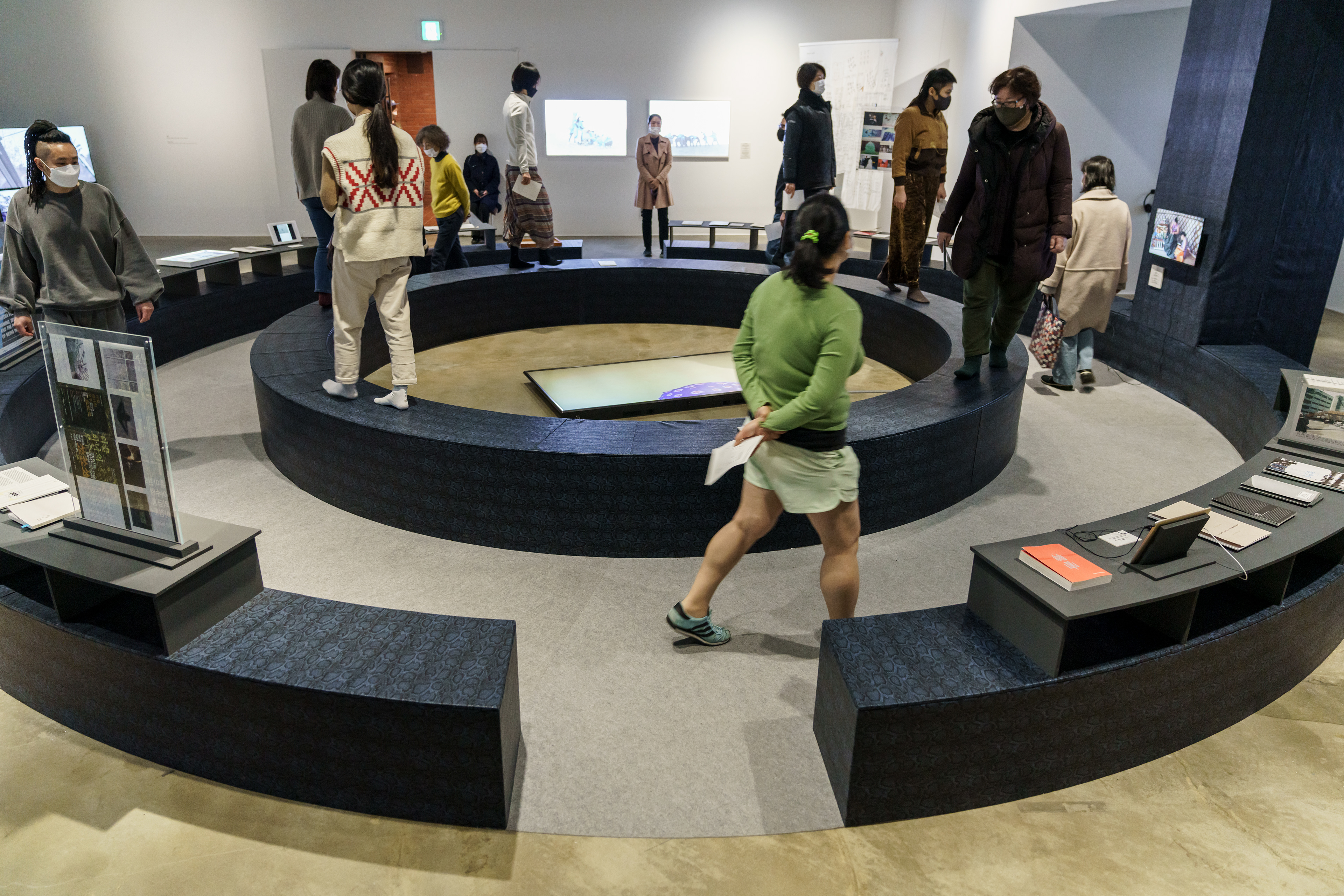 The sounds that whales make range from high frequencies to low frequencies. It is a communication tool with their family groups while they travel in the deep sea, and it functions as a mediator for perceiving the outer world. However, the noises from ships and airplanes make the whales’ voices weaker, and in the worst case, they become deaf or get lost. The artist distorts a recording of eight different whales, which human beings cannot hear or elaborate, and plays it in the exhibition space. The recording was done by MBARI. Like whales that explore their worlds through sounds, audiences lie down in an open “room” that resembles a raft, feel the ocean, and float together. The world made up of the whales’ voices comes in contact with the audiences’ bodies and creates a multi-sensory experience.